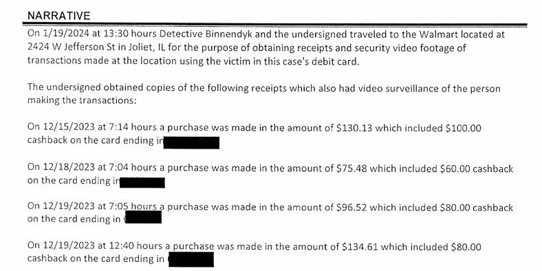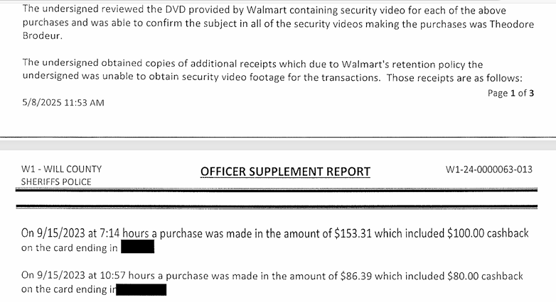 From there, detectives showed him photographs and receipts from a Joliet Walmart store purchase from Nov. 29, 2023, and they asked Brodeur about his $100 cashback receipt.