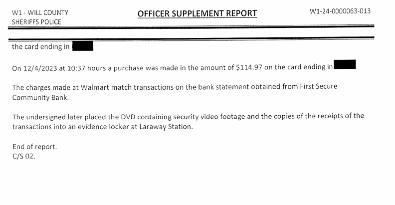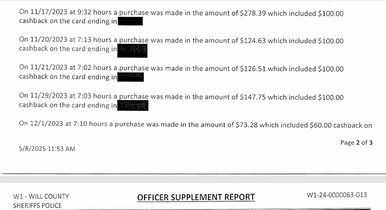 Detective Lithgow provided Brodeur with photographic evidence and the receipts of him using Big Brothers/Big Sisters debit and credit cards to make purchases. He was shown a photograph of himself and another person, whose name was redacted in the police report, making a purchase at the Joliet Hobby Lobby store.