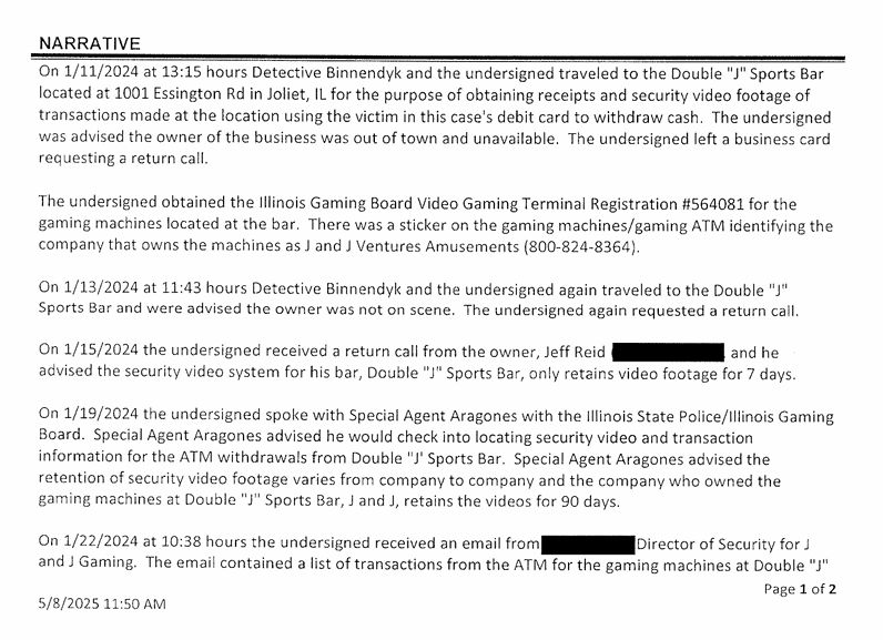 "Ted advised the money from there would have been used in the gaming machines and advised that he didn't even want to see those pictures," the detective indicated. "Detective Binnendyk asked Ted if there were any other places he withdrew from and Ted advised he did at the Bullpen in Shorewood. Ted advised he also did at McBride's.