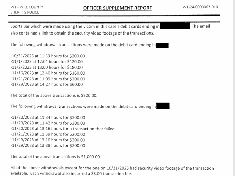 "Ted advised (name redacted) had to be seeing the transactions because she would ask him about the transactions. Ted advised (name redacted) would ask through text or call about the transactions. Ted advised it was spiraling downhill and eventually he stopped keeping track of the transactions when at the beginning he would put everything down on spreadsheets," the sheriff's report showed.
