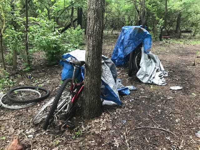 Eventually, after walking approximately a half-mile, we came upon an area inside the forest with at least a half dozen tents that looked to be well-kept. Several bicycles were parked nearby.