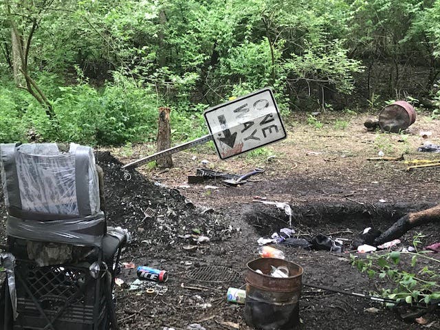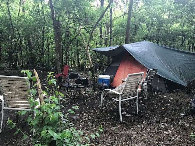Tent City is located in a large forest bordered on one side by the back of the Mt. Olivet Cemetery and the railroad tracks along Washington Street.