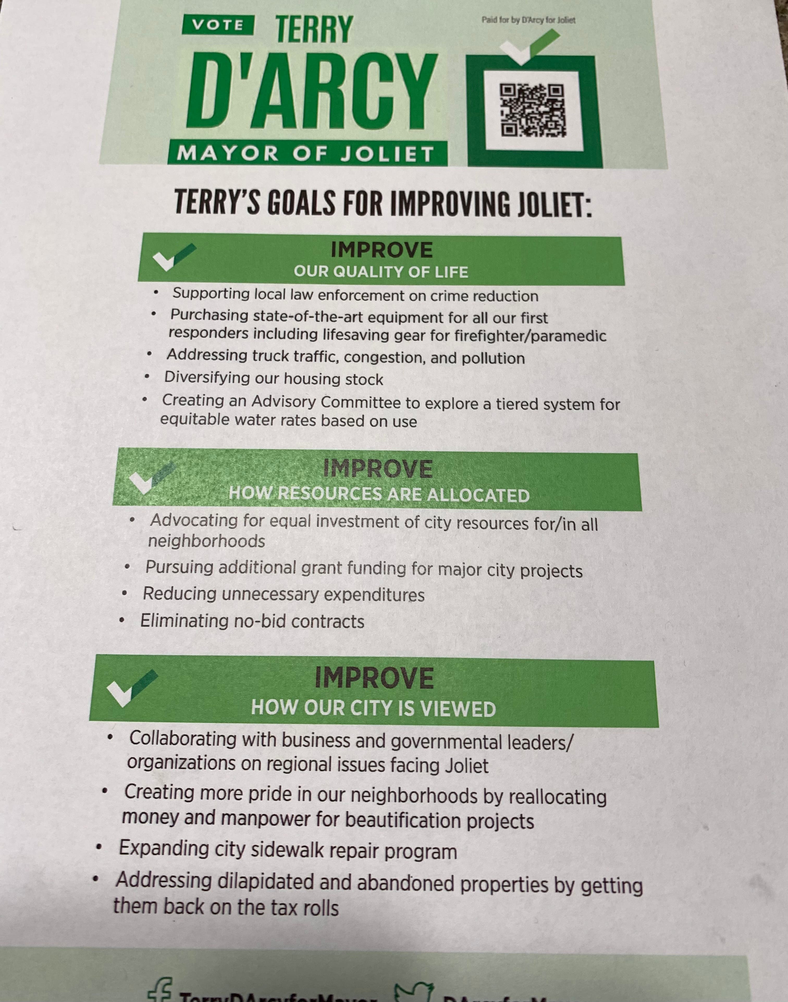 Since his campaign announcement last June, D'Arcy has met with hundreds of citizens across Joliet. "A lot of people just don't feel like Joliet shows its pride when other people are entering our city the first time," D'Arcy remarked.