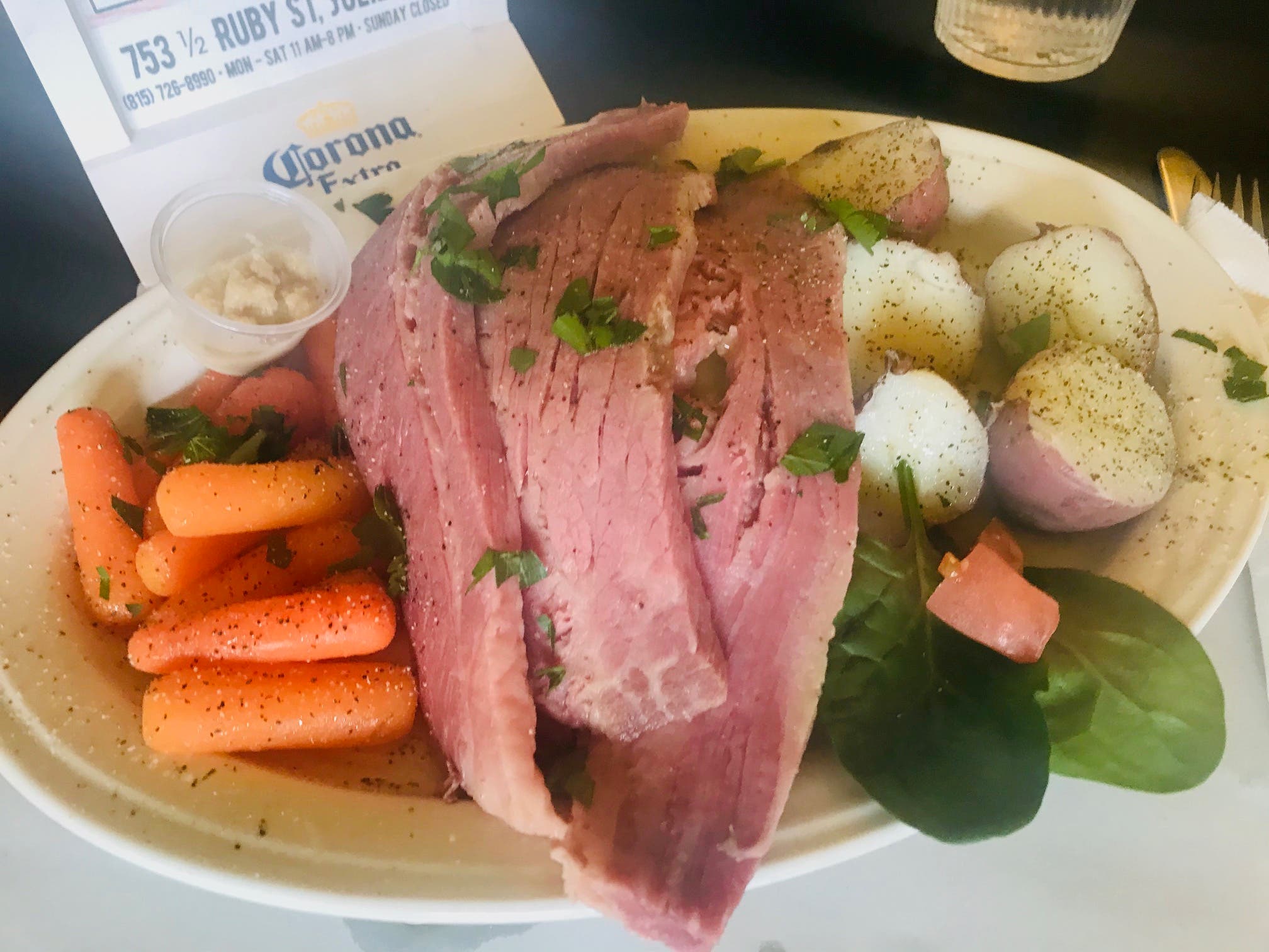 The Thayer's Deli corned beef and cabbage comes with buttered carrots and parsley potatoes. And you get a bowl of soup. The entire meal costs $12.50.