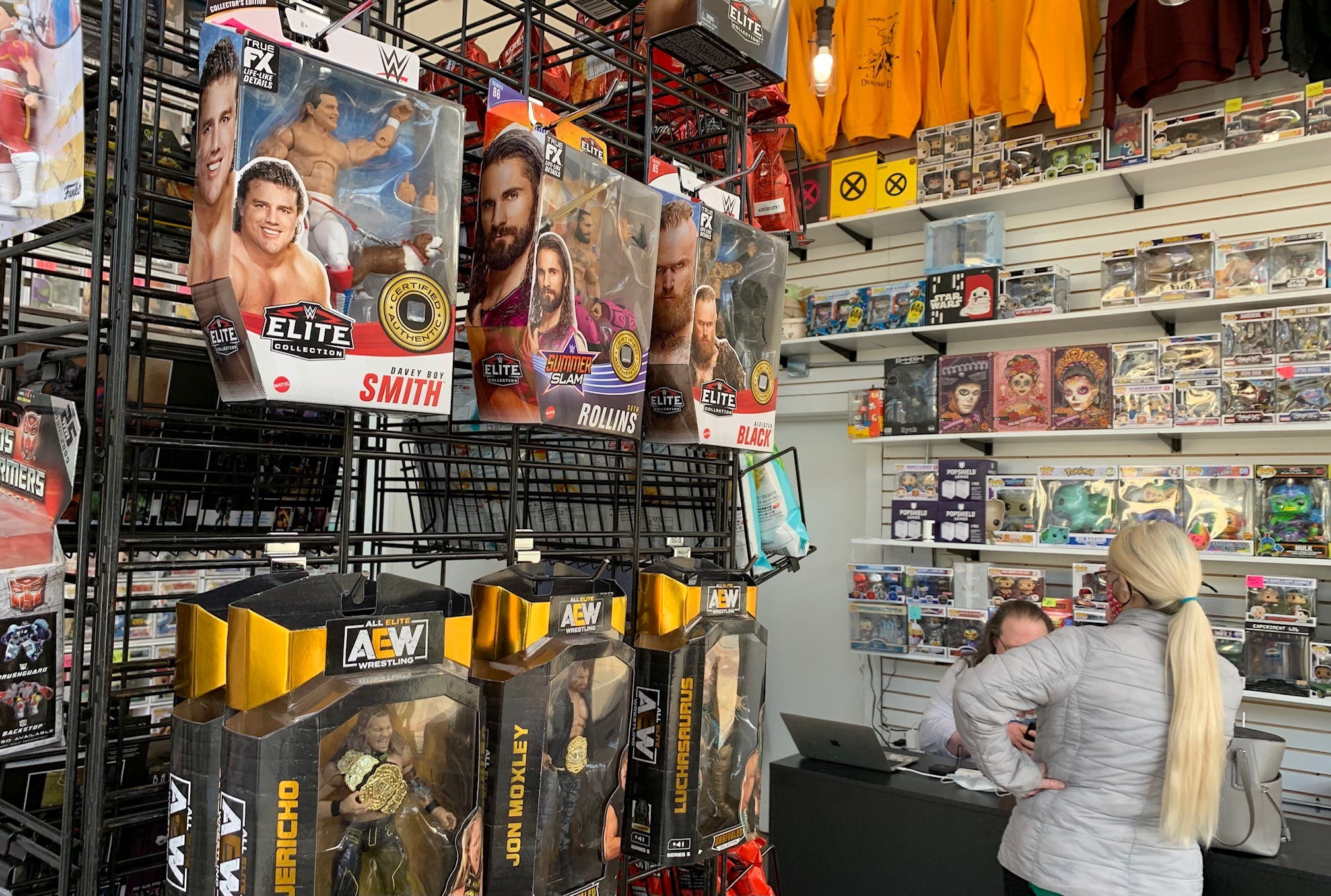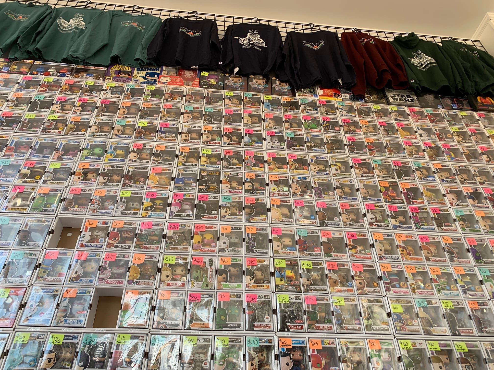 There's about 20 feet of store wall "filled to the brim with around 800" pop vinyl figures including Marvel Comics, DC Comics, Transformers, sports, horror movies and more.