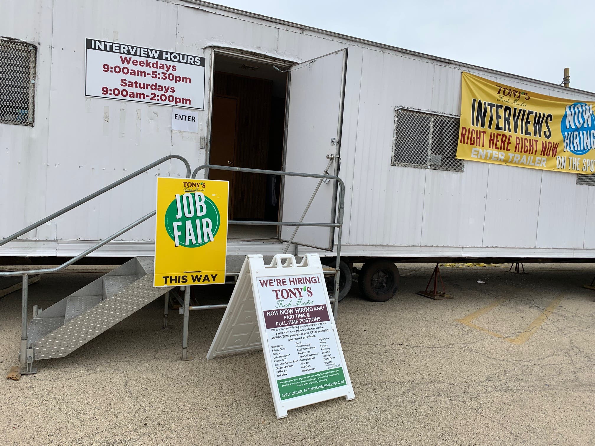 Dozens of Tony's employees were also at the construction site Friday stocking their shelves. There's a trailer in the parking lot where several prospective job candidates showed up Friday for their job interviews.