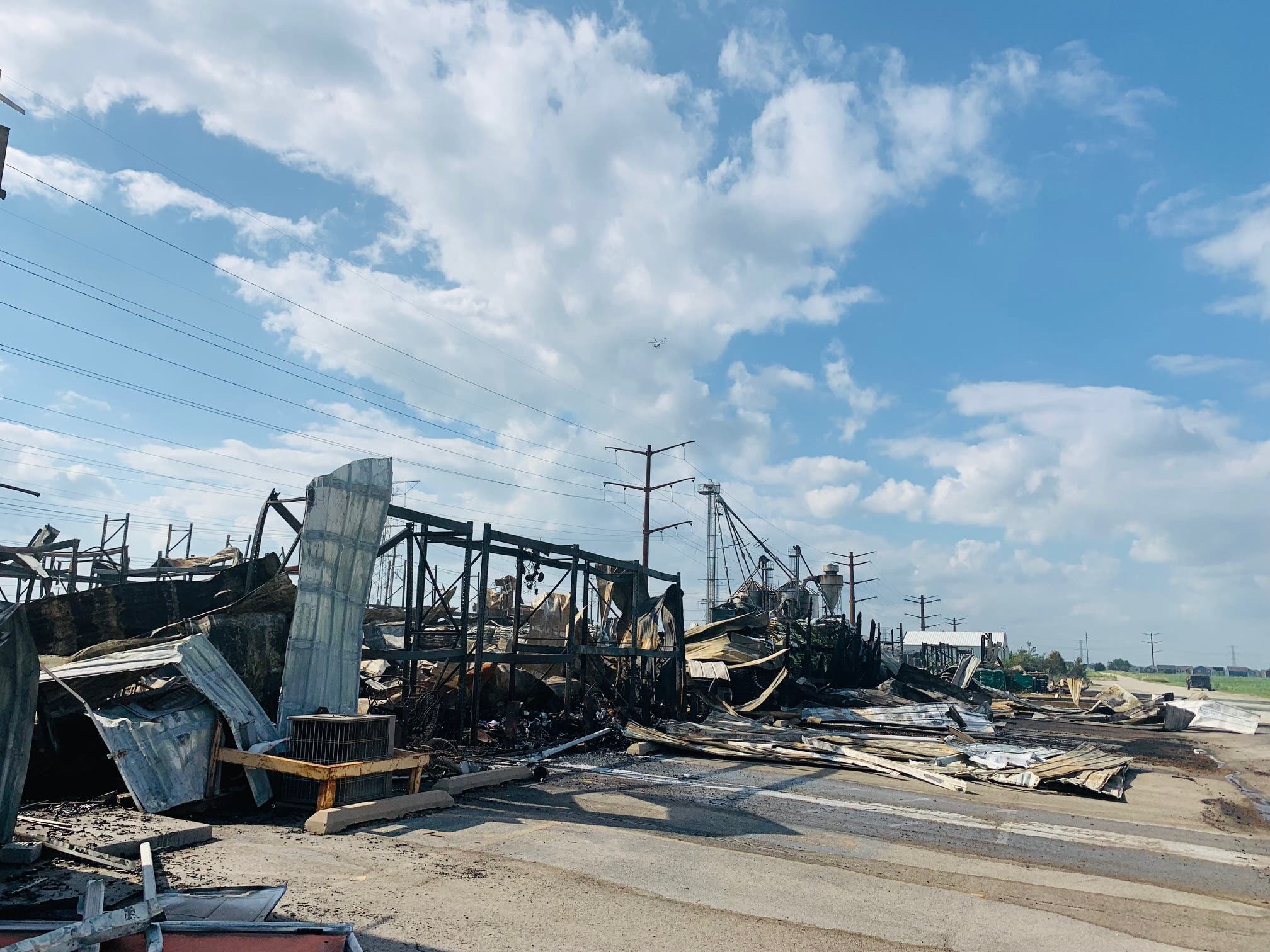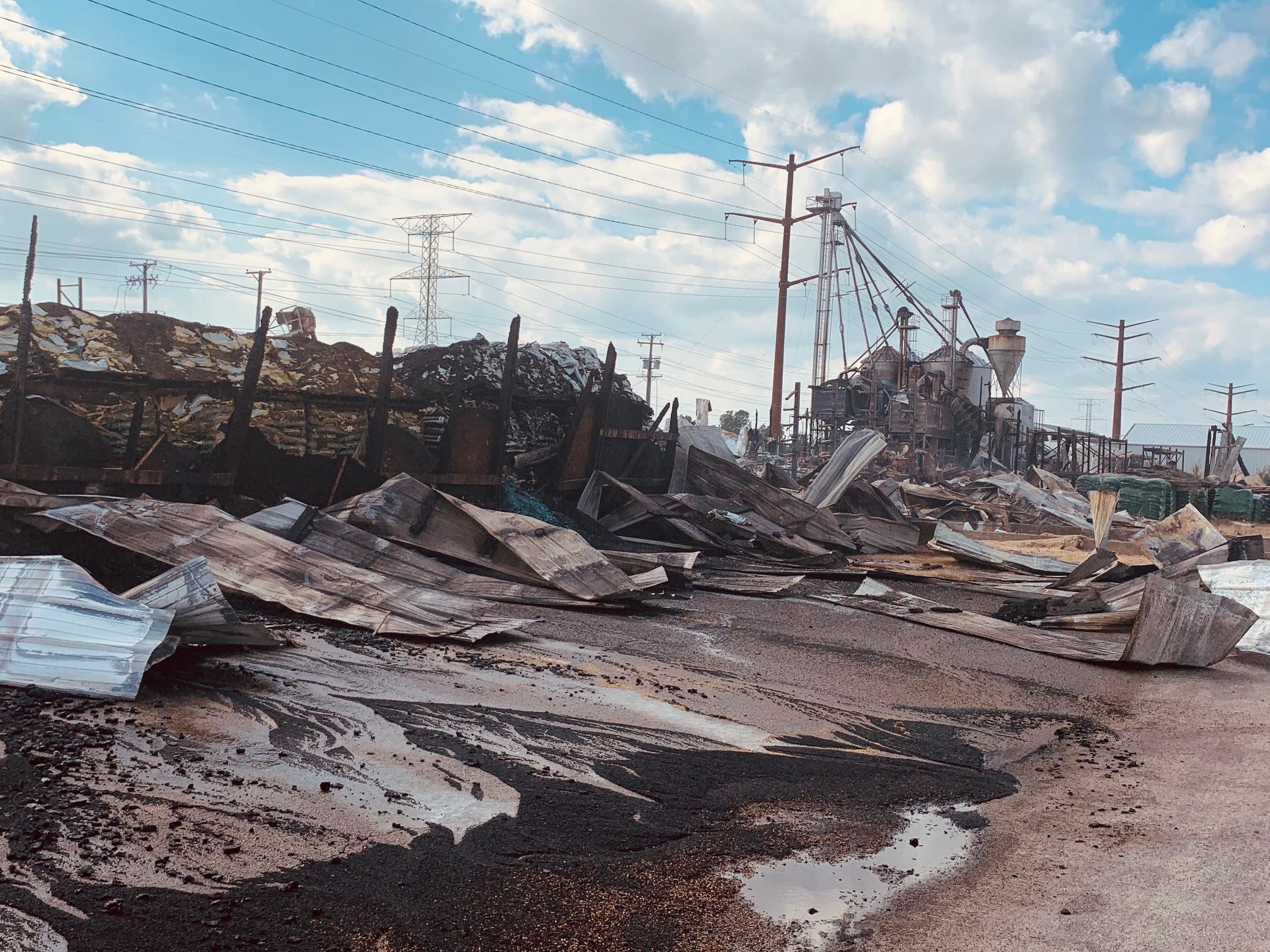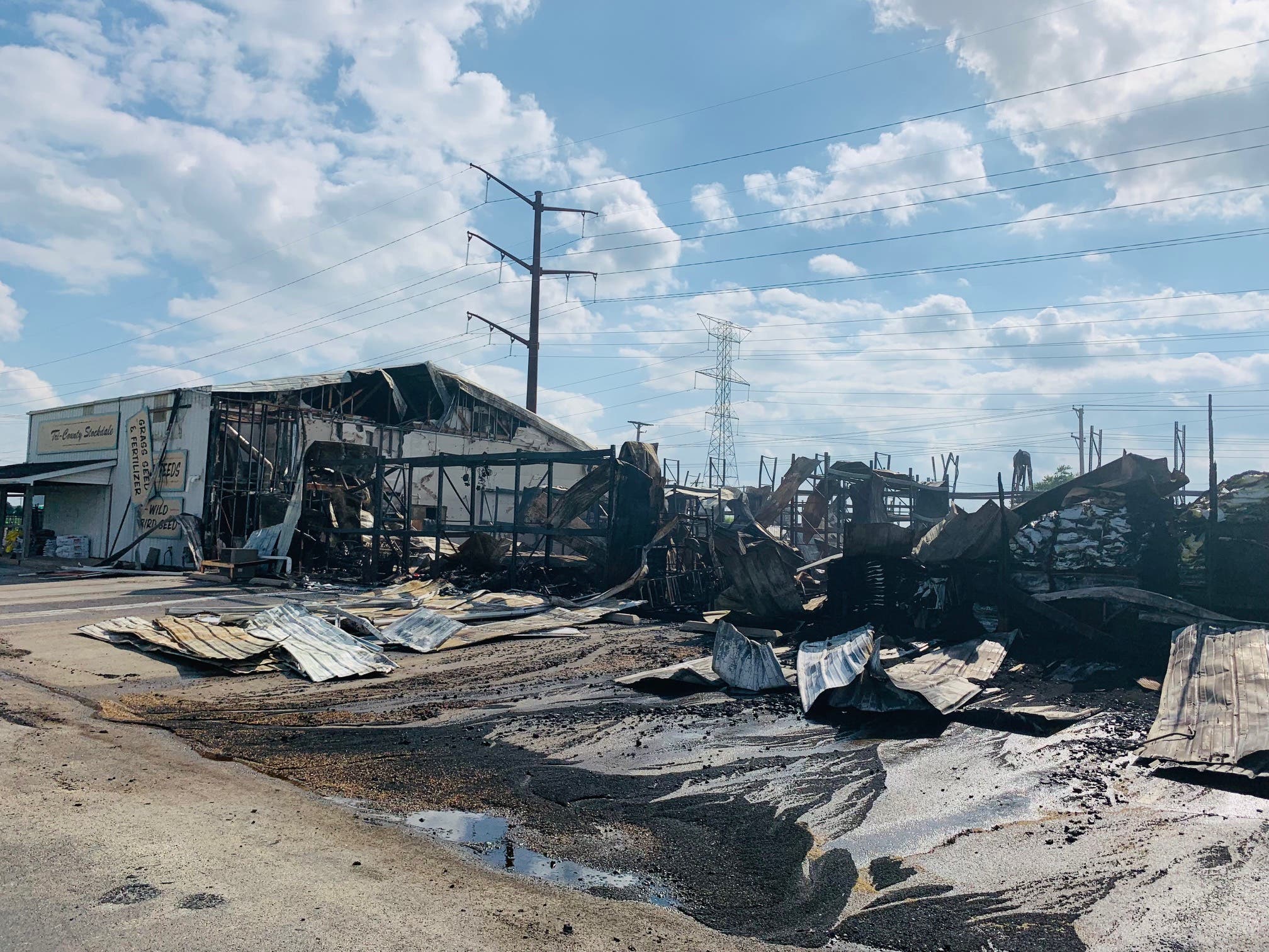 The fire destroyed practically all of Tri County Stockdale's property including several pole barns where fertilizers, pesticides, chemicals and animal feed were stored, according to the fire chief.