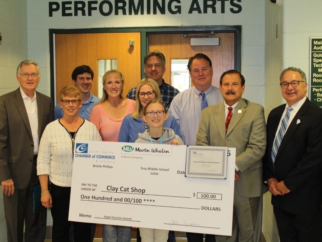 Photo: Troy Middle School 8th grader Brielle Phillips was given an Angel Investor Award by the Joliet Region Chamber of Commerce and Industry for her business, ClayCatShop, which she promoted through the Troy Entrepreneur Club.