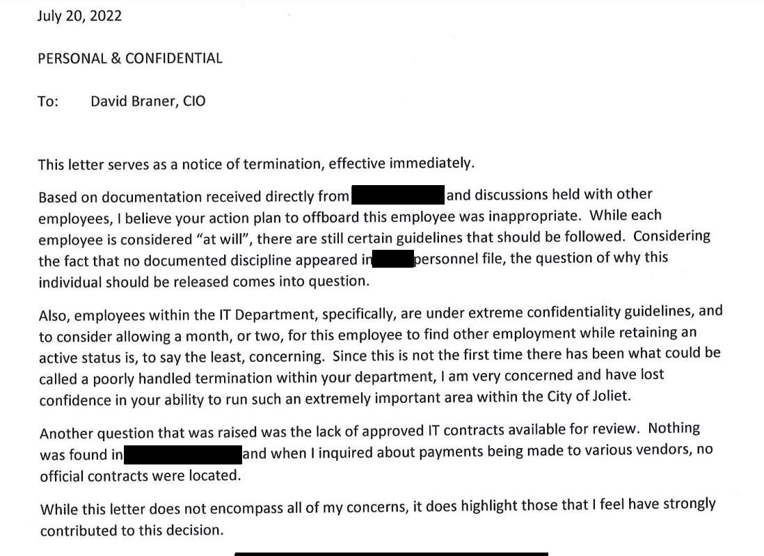 Joliet Patch obtained a letter sent to information technology director David Braner informing him why Jim Capparelli was done with him.