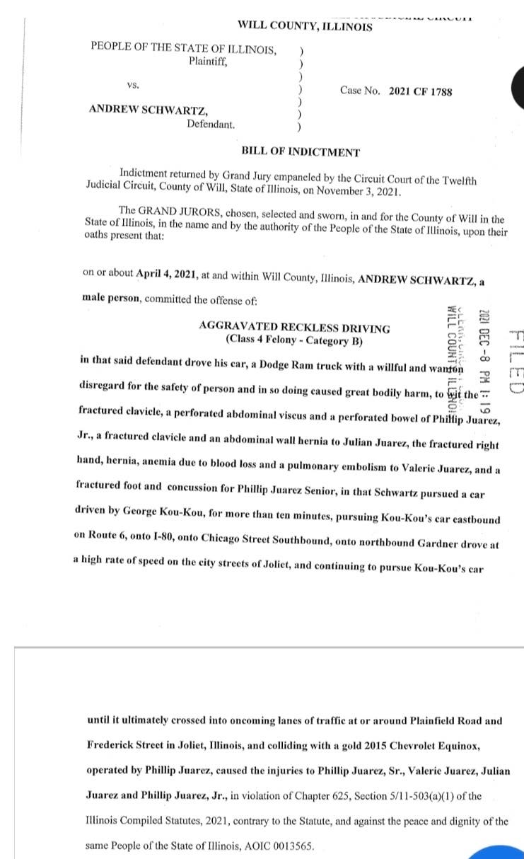 Prosecutors said that "Schwartz pursued a car driven by George Kou-Kou for more than 10 minutes, pursuing Kou-Kou's car eastbound on Route 6, onto I-80, onto Chicago Street southbound, onto northbound Gardner Street," as Schwartz "drove at a high rate of speed on the city streets of Joliet and continuing to pursue Kou-Kou's car until it ultimately crossed into oncoming lanes of traffic at or around Plainfield Road and Frederick Street in Joliet and colliding with a gold 2015 Chevrolet Equinox operated by Phillip Juarez."