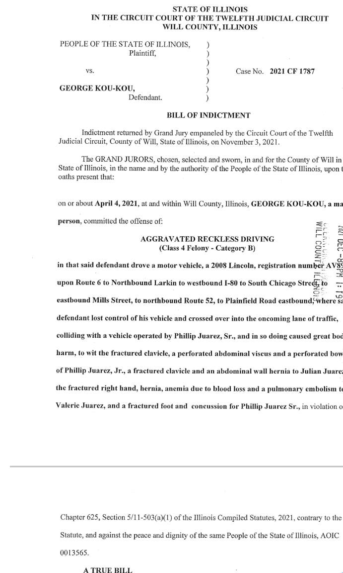As for the now 21-year-old Kou-Kou, he was also indicted this week by the Will County grand jury on one count of aggravated reckless driving.