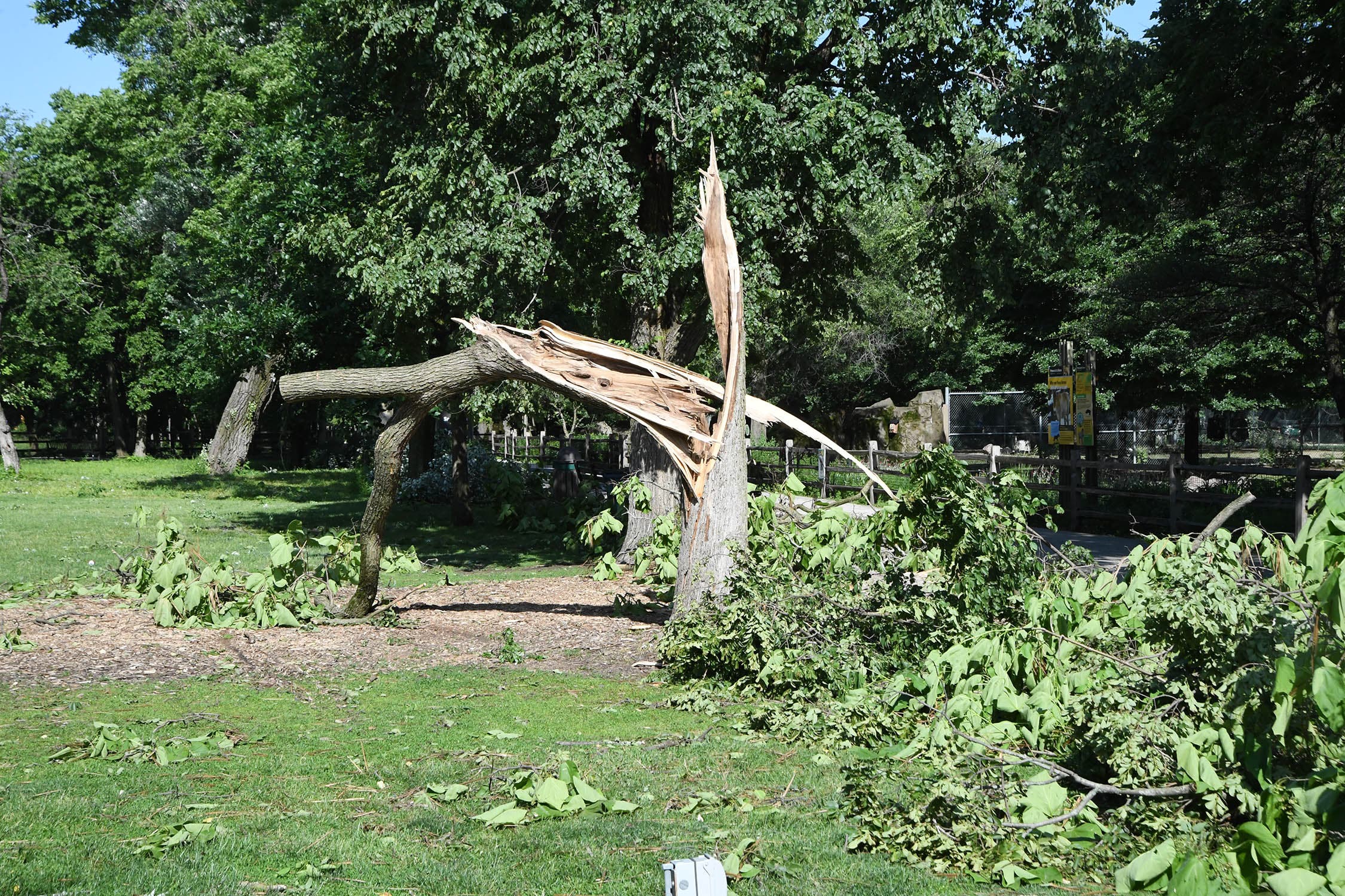 BROOKFIELD, IL – Brookfield Zoo delayed its opening until 1 p.m. Tuesday to allow the grounds crew to clean up after the zoo sustained extensive damage in Monday's storm.