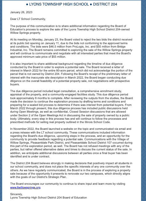 It disputed arguments from District 107, Pleasant Dale Park District and the village of Willow Springs that they were left out of the loop until Nov. 30, when the high school announced its interest in selling.