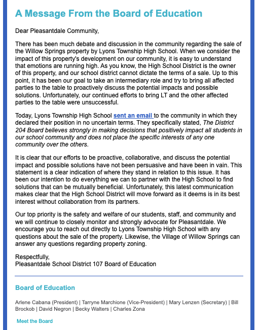 LA GRANGE, IL – Burr Ridge-based Pleasantdale School District 107 has declared its efforts to find common ground with Lyons Township High School to be "in vain."