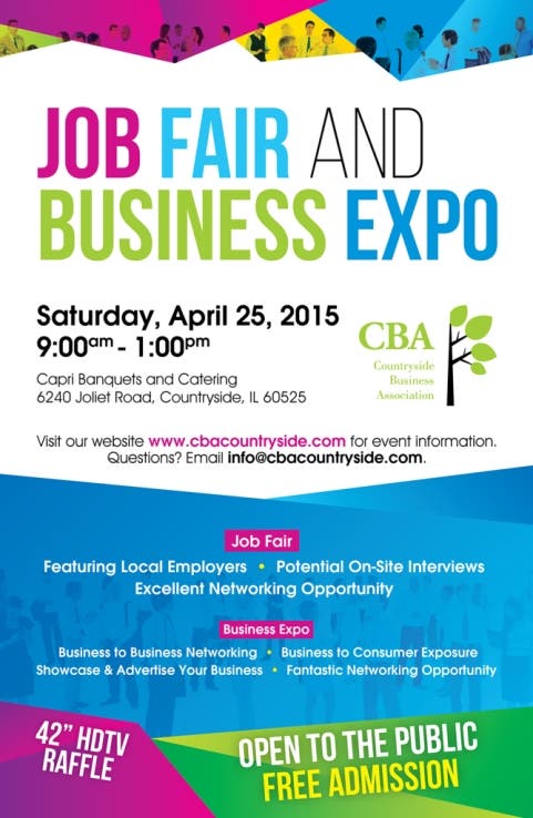 The Countryside Business Association (CBA) is hosting a Job Fair & Business Expo on April 25, 2015 from 9:00 am to 1:00 pm at Capri Banquets and Catering, 6240 Joliet Rd., Countryside.