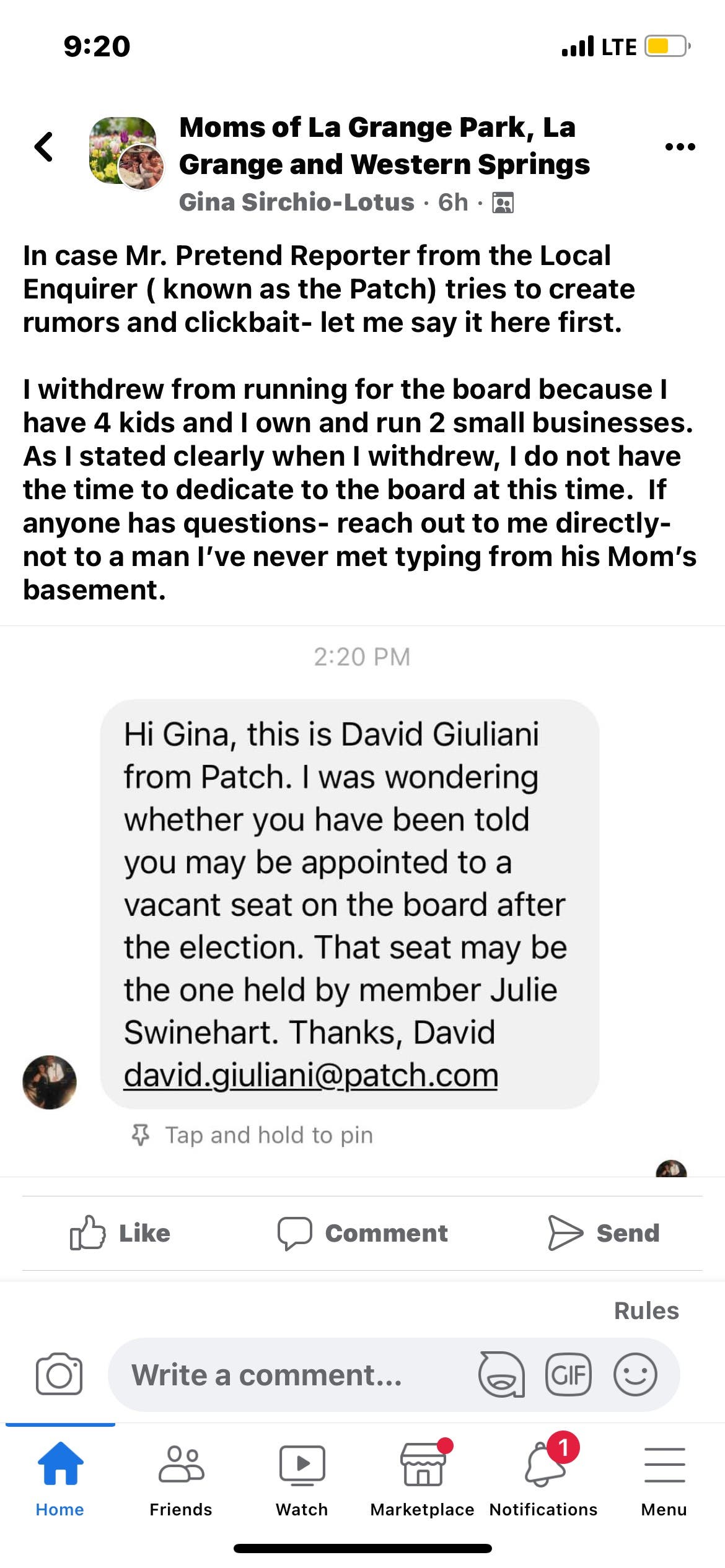 She said she was writing in case "Mr. Pretend Reporter from the Local Enquirer (known as the Patch) tries to create rumors and clickbait – let me say it here first."