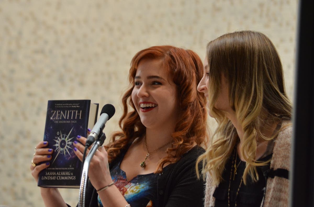 Woodlands Academy alumna Sasha Alsberg (left), appeared at the school along with co-author Lindsay Cummings on Jan. 16, the day their New York Times #1 bestselling e-Book -- “Zenith: the Androma Saga” – was released in hard cover.