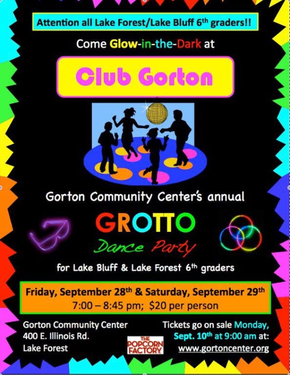Tickets go on sale Monday, September 10, 2012 at 9:00 a.m. for the Annual 6th Grade Grotto Dance Party. This year's "Glow-in-the-Dark" theme offers Lake Forest/Lake Bluff students a fun night of dancing, games, light snacks and music by Marz/Charisma.