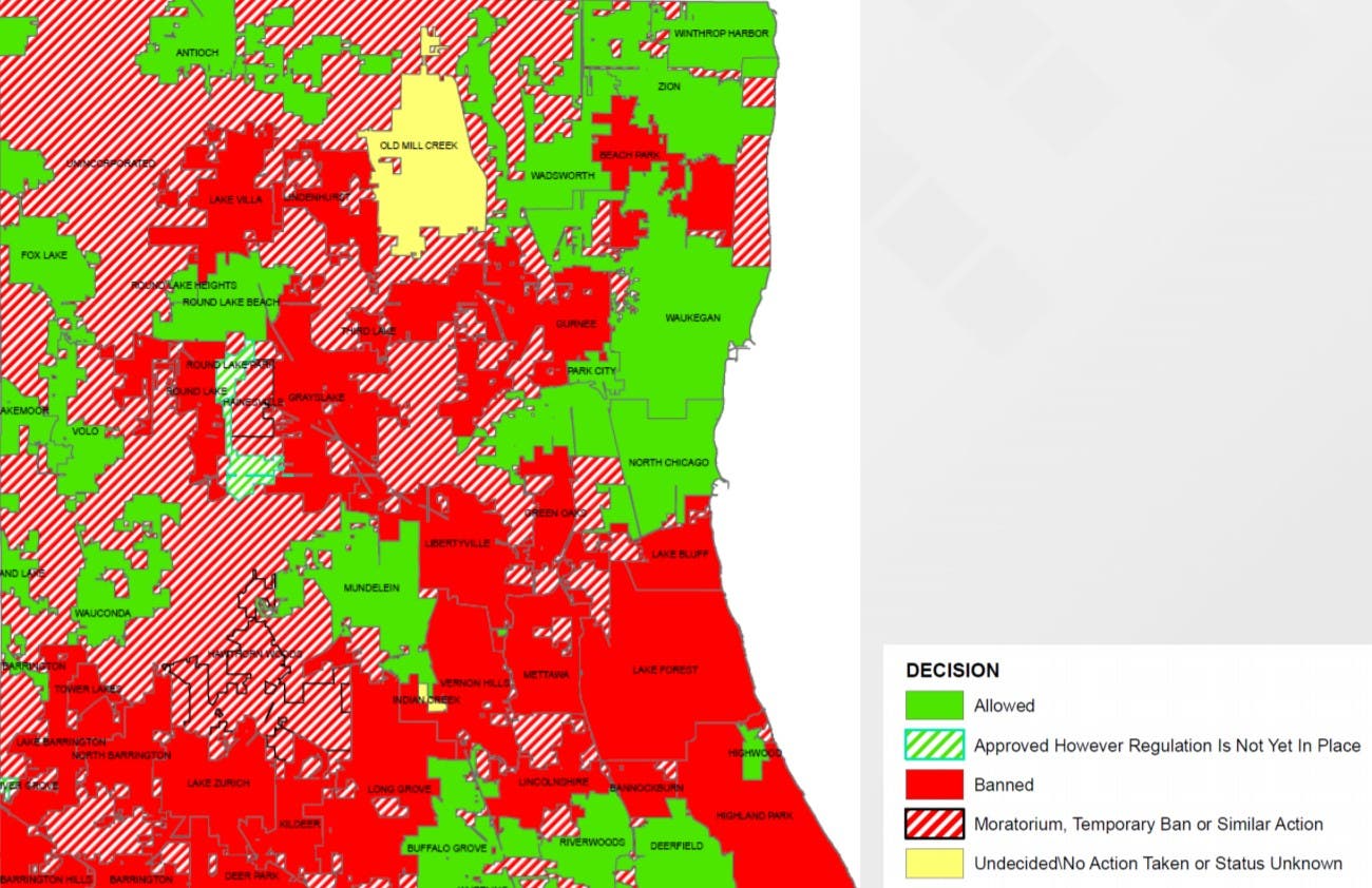 Even though Mundelein is the only recreational dispensary in the county, At least of 23 Lake County municipalities allow for potential adult-use cannabis businesses. The status of Old Mill Creek and Indian Creek are unknown, according to a map prepared by county staff.