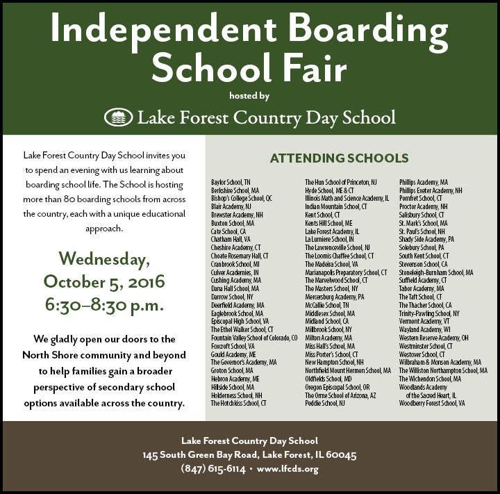Students and families considering boarding school life are invited to Lake Forest Country Day School (LFCDS) to spend an evening with us at our Independent Boarding School Fair on Wednesday, October 5 in the Green Bay Atrium. The event will be run from 6:30 p.m. to 8:30 p.m. and will feature more than 80 diverse boarding schools from across the country, each with a distinctive educational approach. LFCDS has hosted this fair for the past twelve years as a service to families from the North Shore and surrounding communities who are considering boarding school for their students, and the public is encouraged to attend.