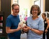 Attendees were encouraged to take a cookie and have some tea or pink lemonade. Polka-dotted party hats were available to wear and a display of “then and now” comparison photos were set up in the entrance lobby.