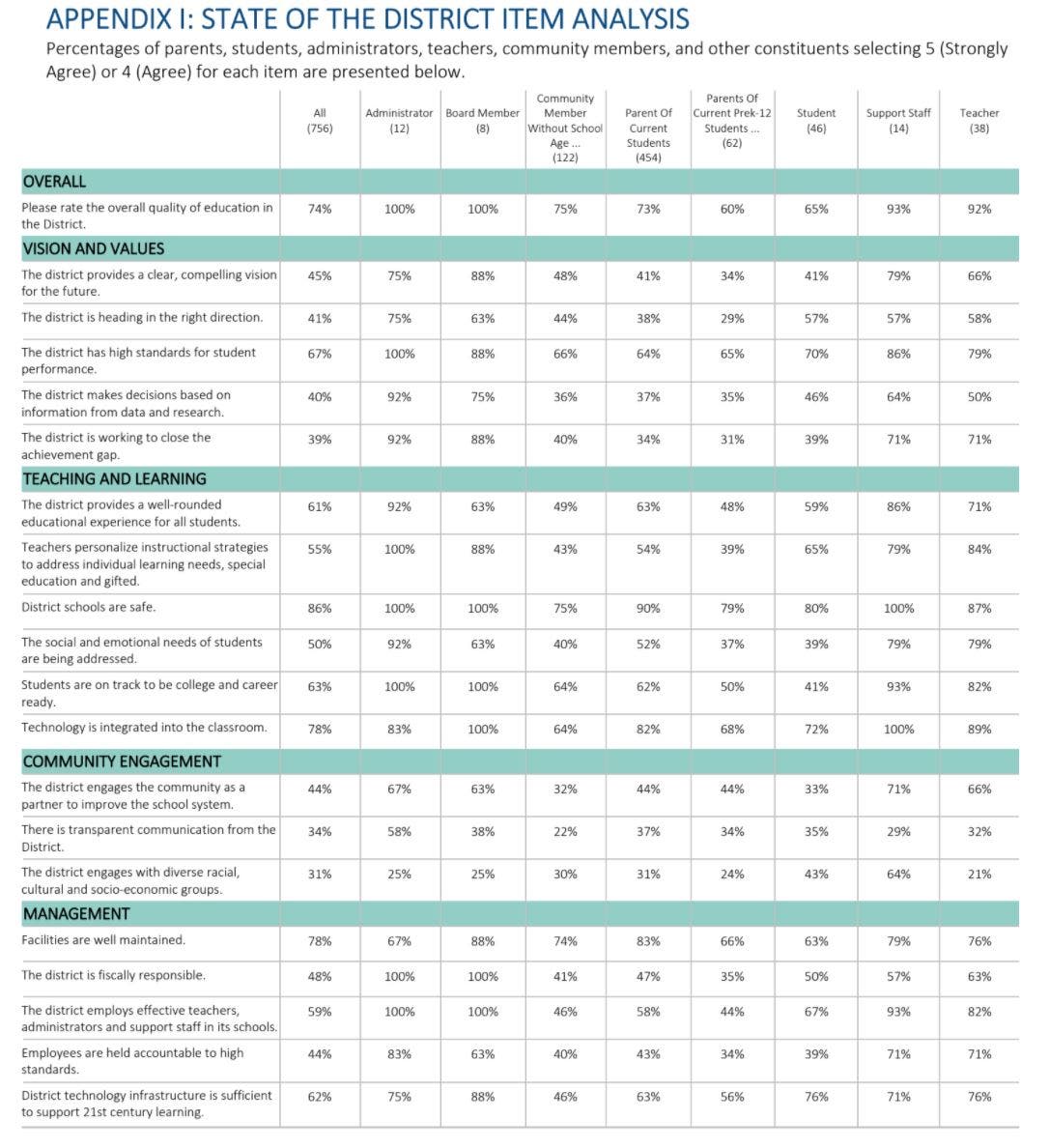 Only about a third of respondents agreed with the statements "there is transparent communication from the District" and "the district engages with diverse racial, cultural and socio-economic groups," according to the survey.