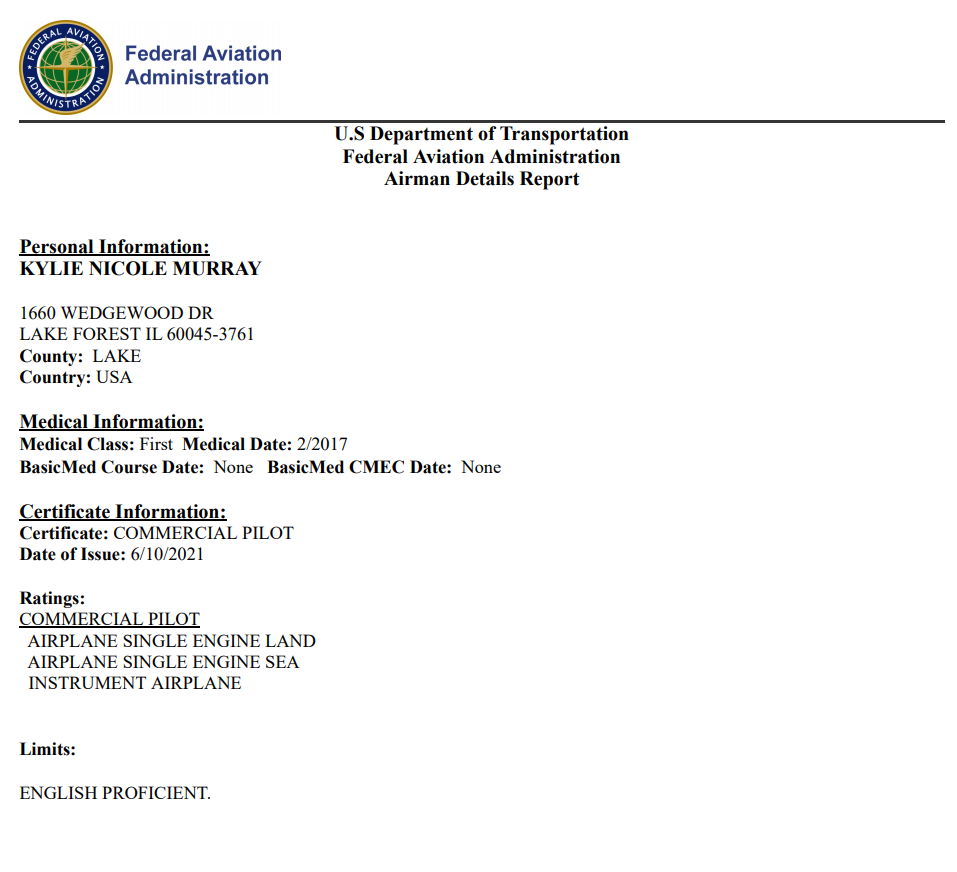 According to Federal Aviation Administration records, Murray was issued a flight instructor license in July 2020 and received a commercial pilot license for single -engine land and sea planes on June 10.