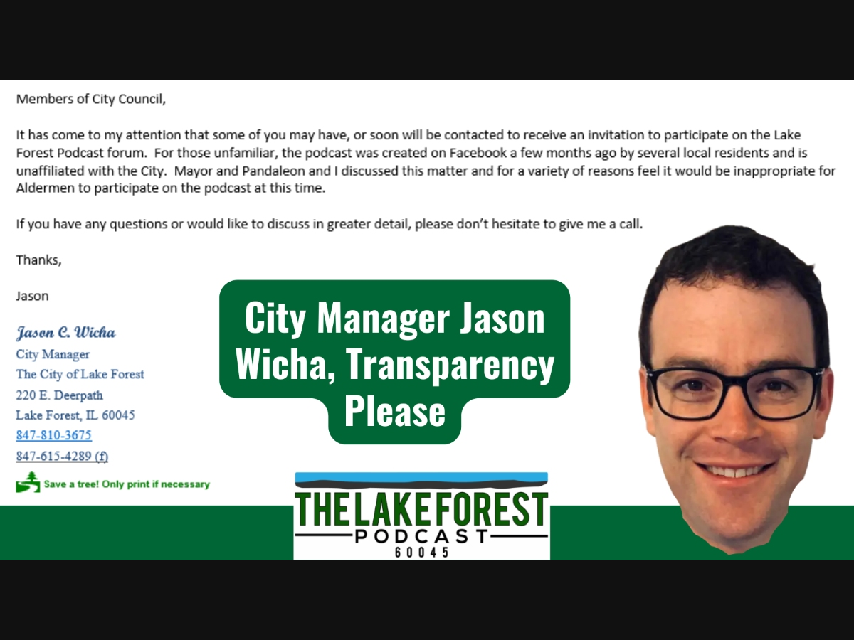 Here is a 2021 email from the Lake Forest Illinois City Manager Wicha telling The City Council of LF to not go on The Lake Forest Podcast