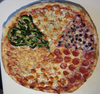 Pepperoni (red), buffalo chicken (orange), pineapple (yellow), spinach and green peppers (green), buffalo chicken and bleu cheese (blue), and kalamatta olives with red onions (purple)slices make up this delectable 20" pie.