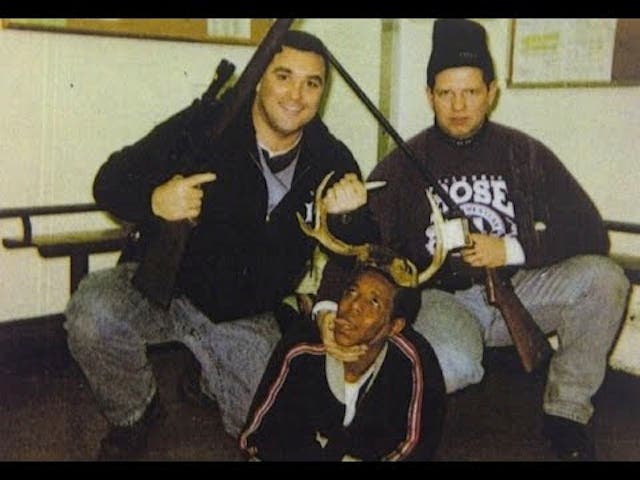 Fired cop Timothy McDermott and another former police colleague, now imprisoned, are posed kneeling with rifles over an African-American man wearing deer antlers in a Polaroid believed taken between 1999 and 2003.