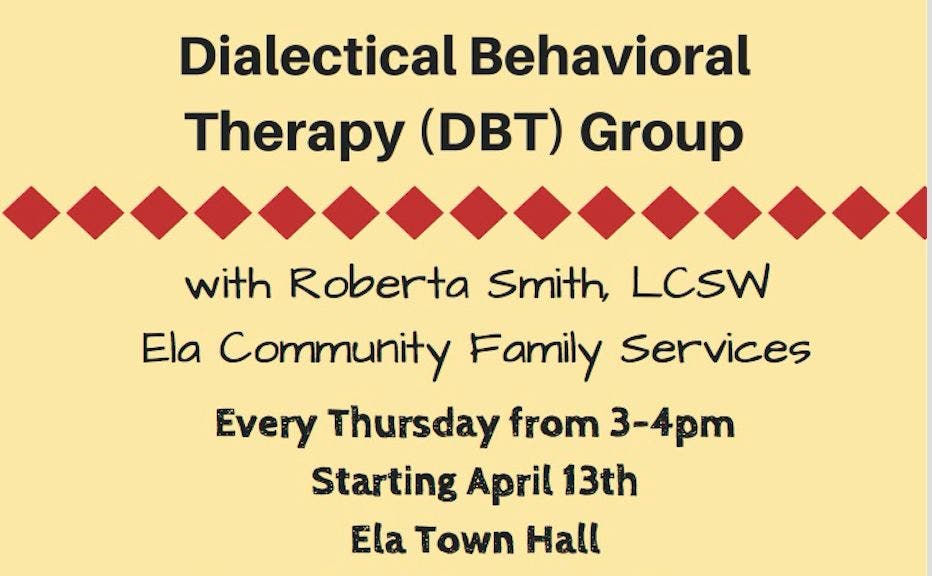 Ela Township Community Family Services will begin a new group, Dialectical Behavioral Therapy Group on April 13. This group is FREE to township residents. Register by Tuesday, April 11 by calling (847) 540-8380.