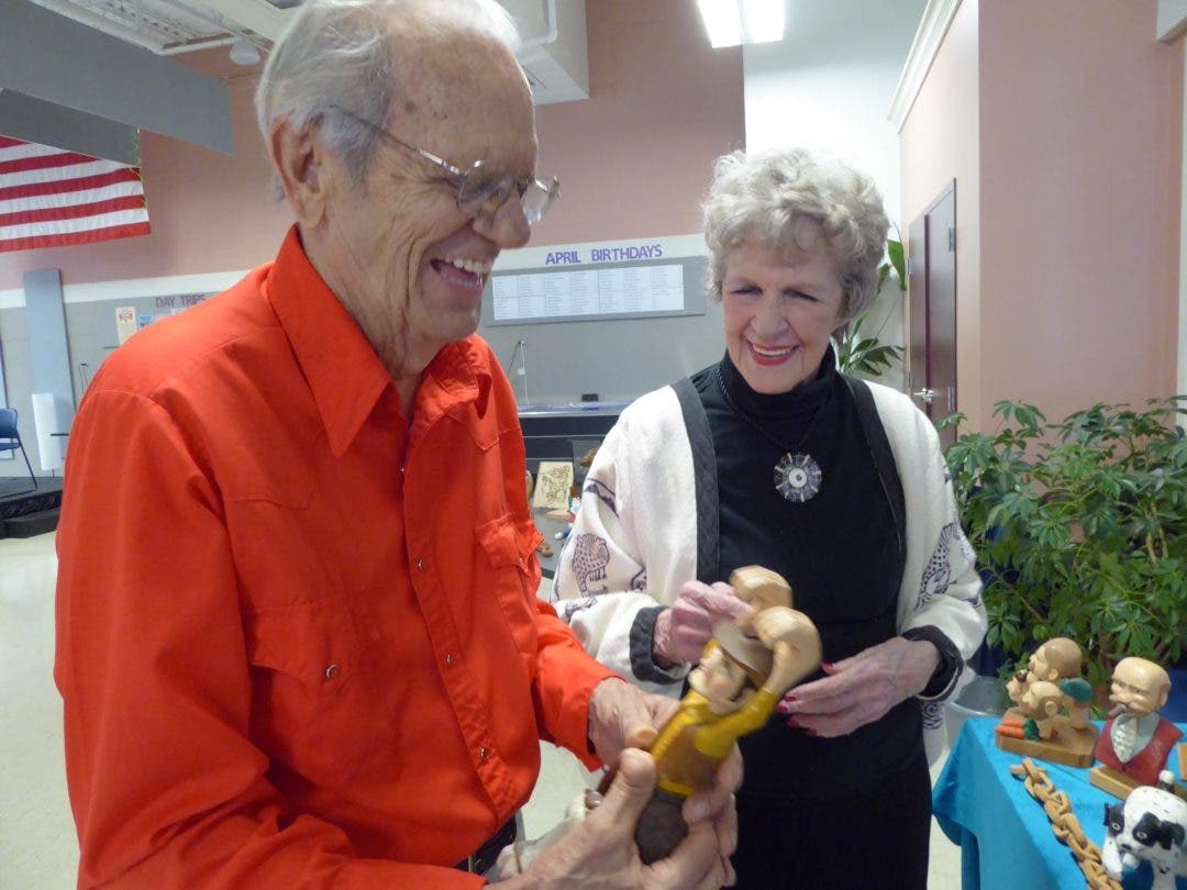 Photo: Woodwork artist Bob Carlson, of Long Grove, and portrait painter Joyce Klug, of Lake Zurich, admired each other’s art at last year’s show.