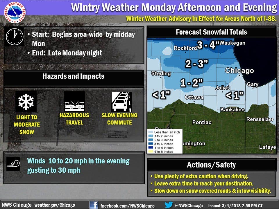 Some of the northern Chicago suburbs could see up to 4 inches of snow through Monday evening. According to the National Weather Service, a winter weather advisory has been issued for McHenry, Lake, Kane, DuPage and Cook counties from 4 p.m. Monday until midnight Monday night.