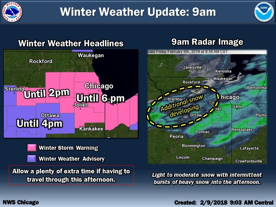 The end times of the storm were extended, as additional snow is developing across northwest Illinois, and will drift eastward this afternoon, according to the NWS.