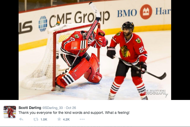 Newest Chicago Blackhawk Scott Darling made his debut in the net Sunday, notching 32 saves in a win over the Ottawa Senators.