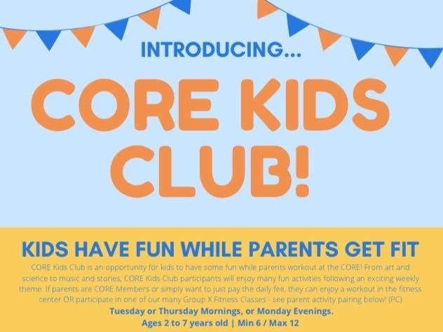 CORE Kids Club is an opportunity for kids to have some fun while parents workout at the CORE! From art and science to music and stories, CORE Kids Club participants will enjoy many fun activties following an exciting weekly theme. If parents are CORE Members or simply want to just pay the daily fee, they can enjoy a workout in the fitness