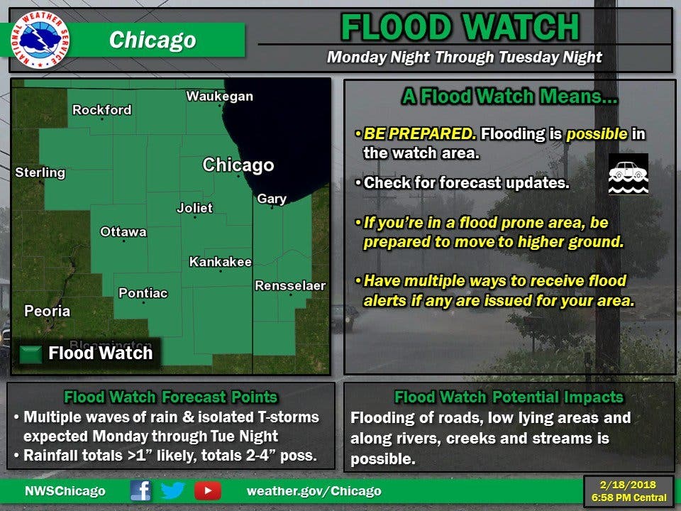 The start of the work week will be a rainy one, and the National Weather Service has issued a flood watch from Monday night through Tuesday night for most of the area. The watch has been issued for Cook, DeKalb, DuPage, Ford, Grundy, Iroquois, Kane, Kankakee, Kendall and Will counties.