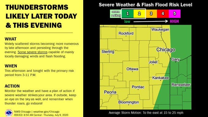 ILLINOIS — While Illinoisans can expect more hot and humid weather Thursday, they should also be aware of possibly severe storms. According to the National Weather Service, there is a significant thunderstorm risk Thursday, as well as a limited risk of hail and an elevated risk of damaging winds up to 70 mph.