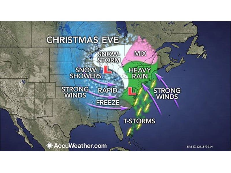 “There is a risk of getting stuck on the road or at an airport terminal especially in the Midwest and Northeast on Christmas Eve into Christmas Day,” according to Accuweather.com.