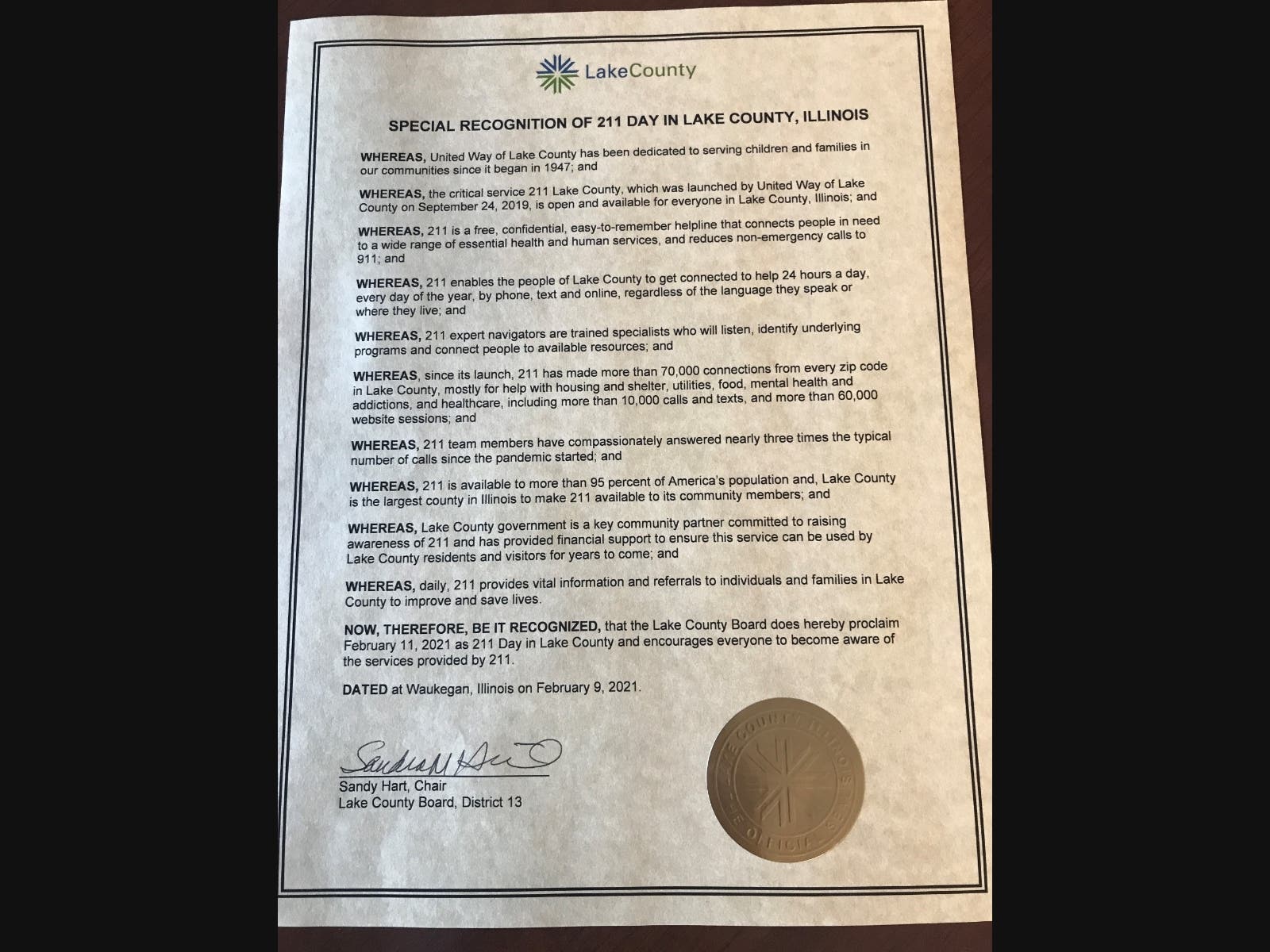 In special recognition of United Way of Lake County’s 211 helpline, the Lake County Board on Tuesday proclaimed February 11 as “211 Day” in Lake County, Illinois. The critical 211 service, led by United Way of Lake County, is open and available for everyone in Lake County. 211 has become Lake County’s one-stop shop for help.