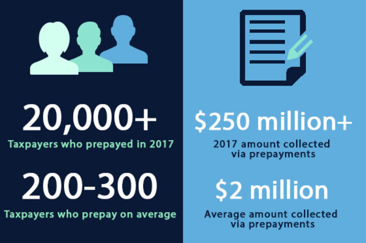 The rush to prepay as a result of recent changes in federal tax legislation led to a record year. More than 20,000 taxpayers prepaid their property taxes in 2017, many of which during the last week of December.