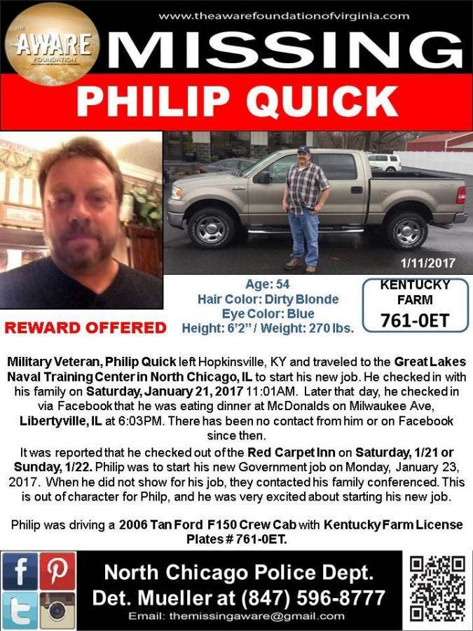 Philip Quick, 54, was on his way from Hopkinsville, Kentucky, to Great Lakes Naval Training Center in North Chicago earlier this week. He was last heard from at 6:03 p.m. Saturday, when he let his family know that he was eating at a McDonald's on Milwaukee Avenue in Libertyville.