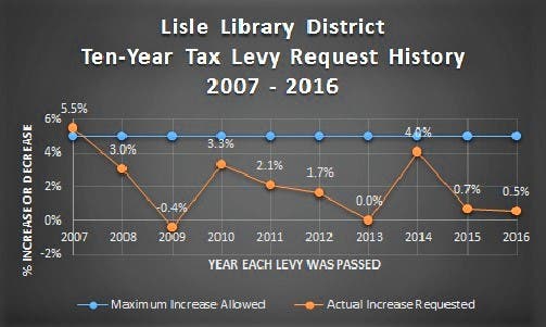 The governmental bodies listed on your property tax bill can increase their tax levy amounts by up to 5% each year through the regular appropriation process (increases of more than 5% trigger additional requirements). The Lisle Library District Board of Trustees hasn't approved a levy increase of 5% or more since 2007. It's been 10 years since the library last requested the "maximum" tax levy increase!