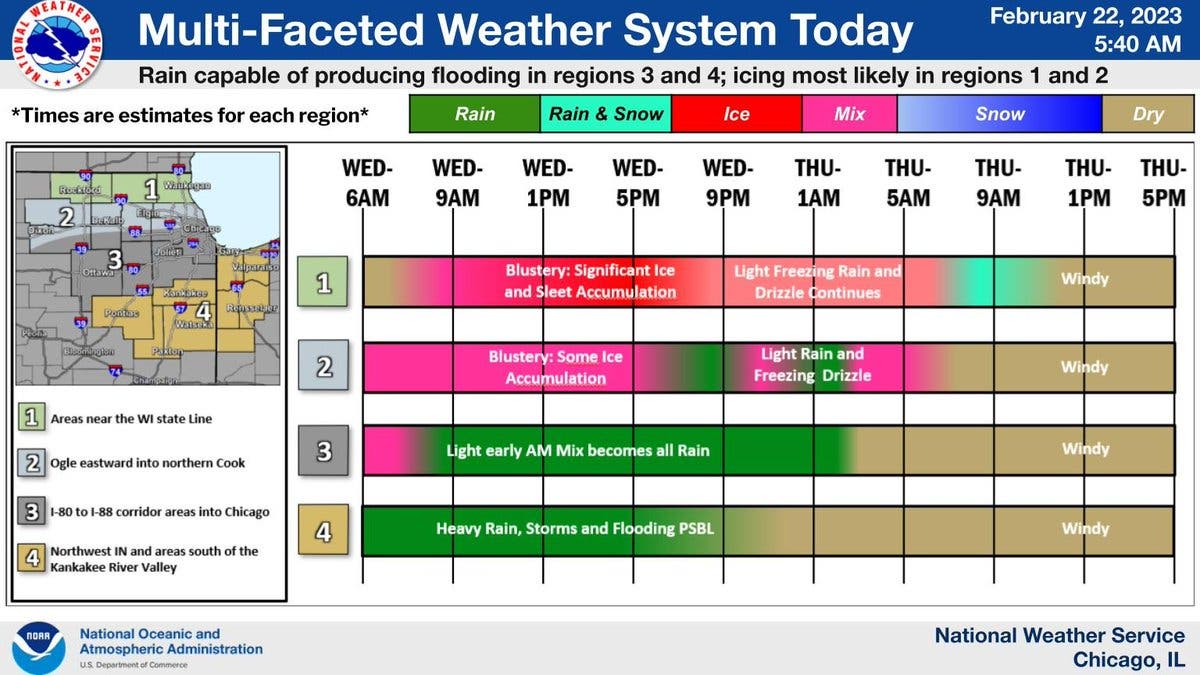 The timing of the severe weather will likely create a treacherous evening commute. After rain, and sleet develop through the morning, the afternoon will likely bring accumulating ice for the northern suburbs and heavy rain to the south, NBC Chicago reported.
