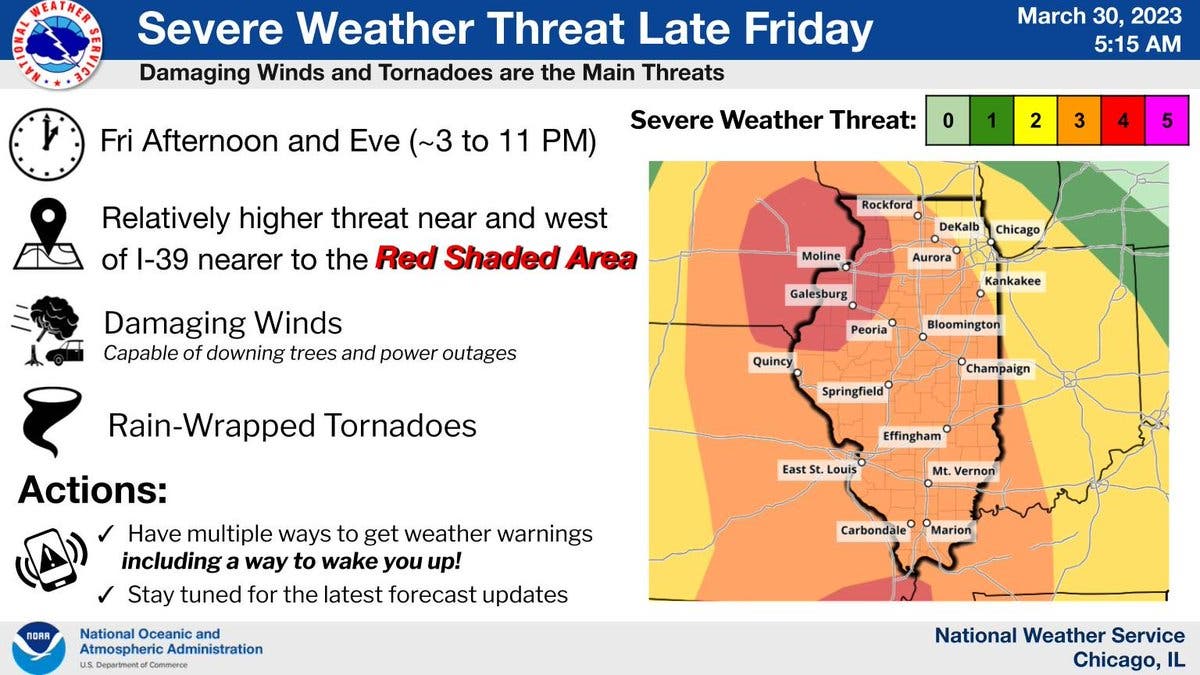 ILLINOIS — Severe thunderstorms are expected Friday as damaging winds and rain-wrapped tornadoes are possible, according to the National Weather Service.