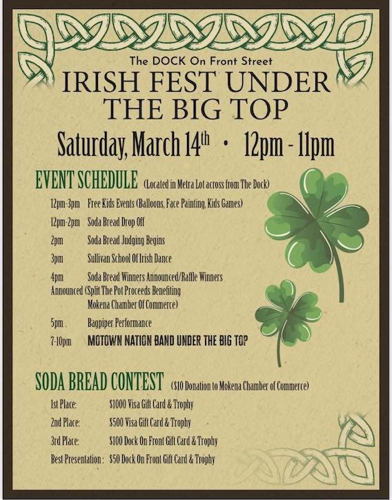 Irish Fest Under The Big Top is set for Saturday, March 14, from 12 to 11 p.m., in the parking lot of the Front Street Metra Station.