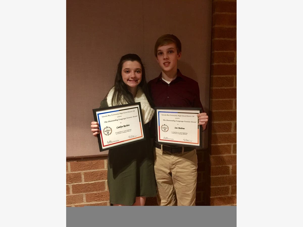 Caitlyn Rochon and Ian Malone were recognized as recipients of the Outstanding Language Learner Award for their efforts in the 8th grade Spanish program at Mokena Junior High. This award was presented as part of the Lincoln-Way Seal of Biliteracy Awards night, Wednesday, April 18th, at Lincoln-Way Central.
