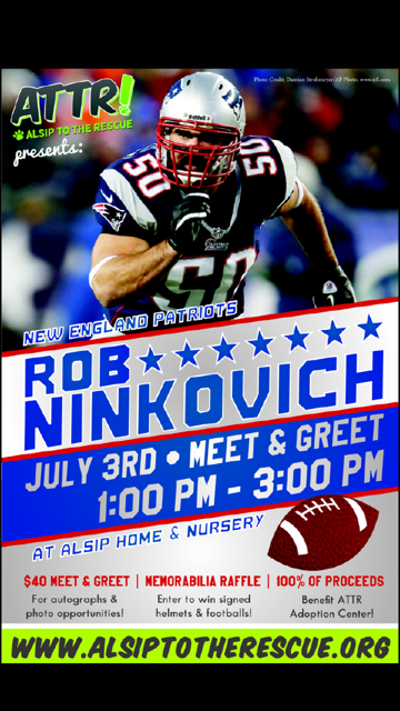 New Lenox native and NFL star Rob Ninkovich of the Super Bowl champion New England Patriots will sign autographs and take photos for a $40 Meet & Greet on July 3, from 1 to 3 p.m. at the store, 20601 S. LaGrange Road in Frankfort. All proceeds will go toward the adoption center. Tickets can be purchased in advance, online.