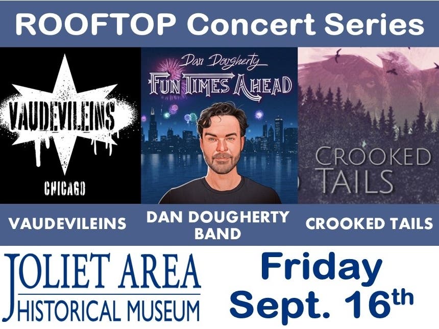 Friday, Sept. 16th at 7pm, the Joliet Area Historical Museum's "Rooftop Summer Concert Series" presents 3 great bands - Vaudevileins, Crooked Tails, and Dan Dougherty Band!