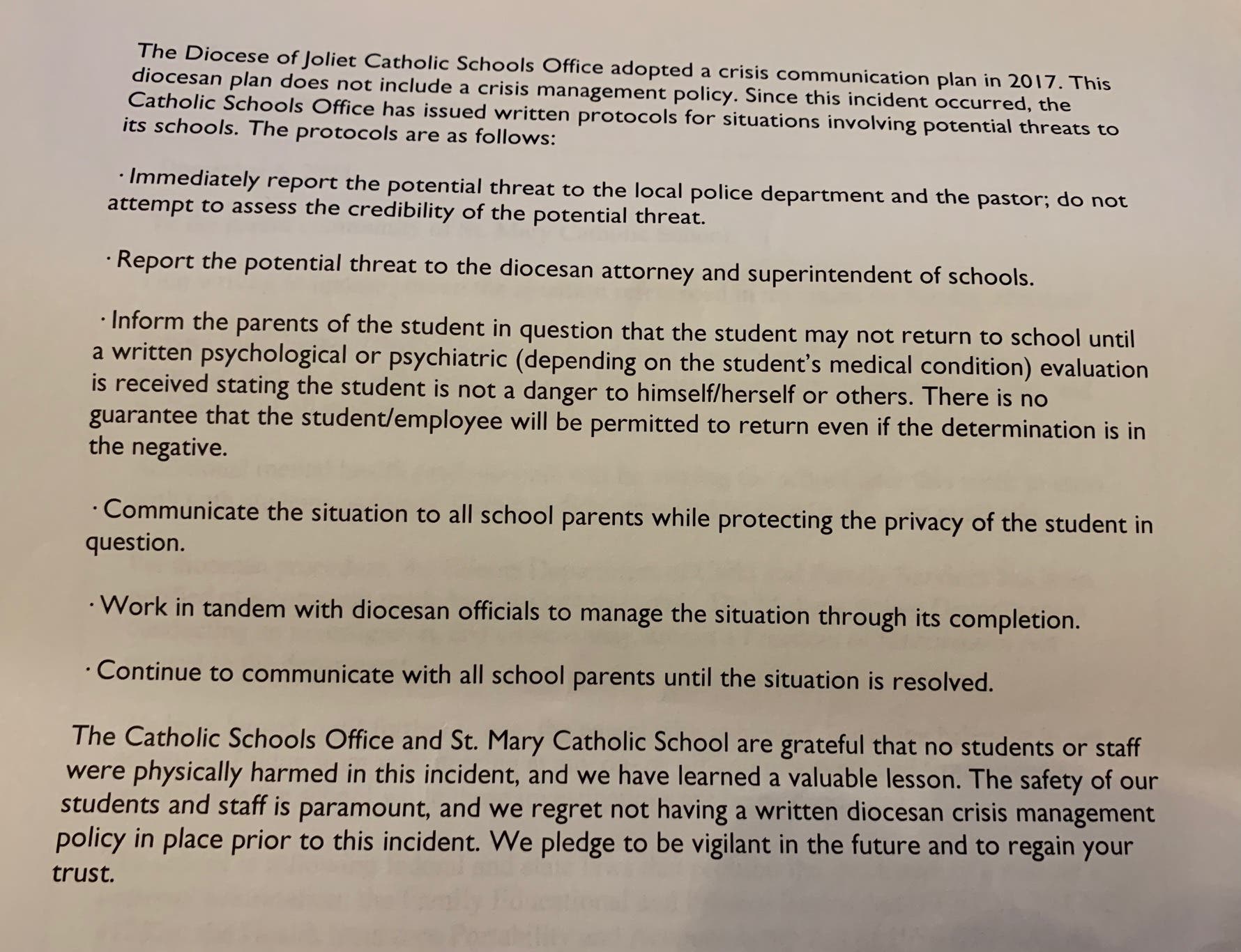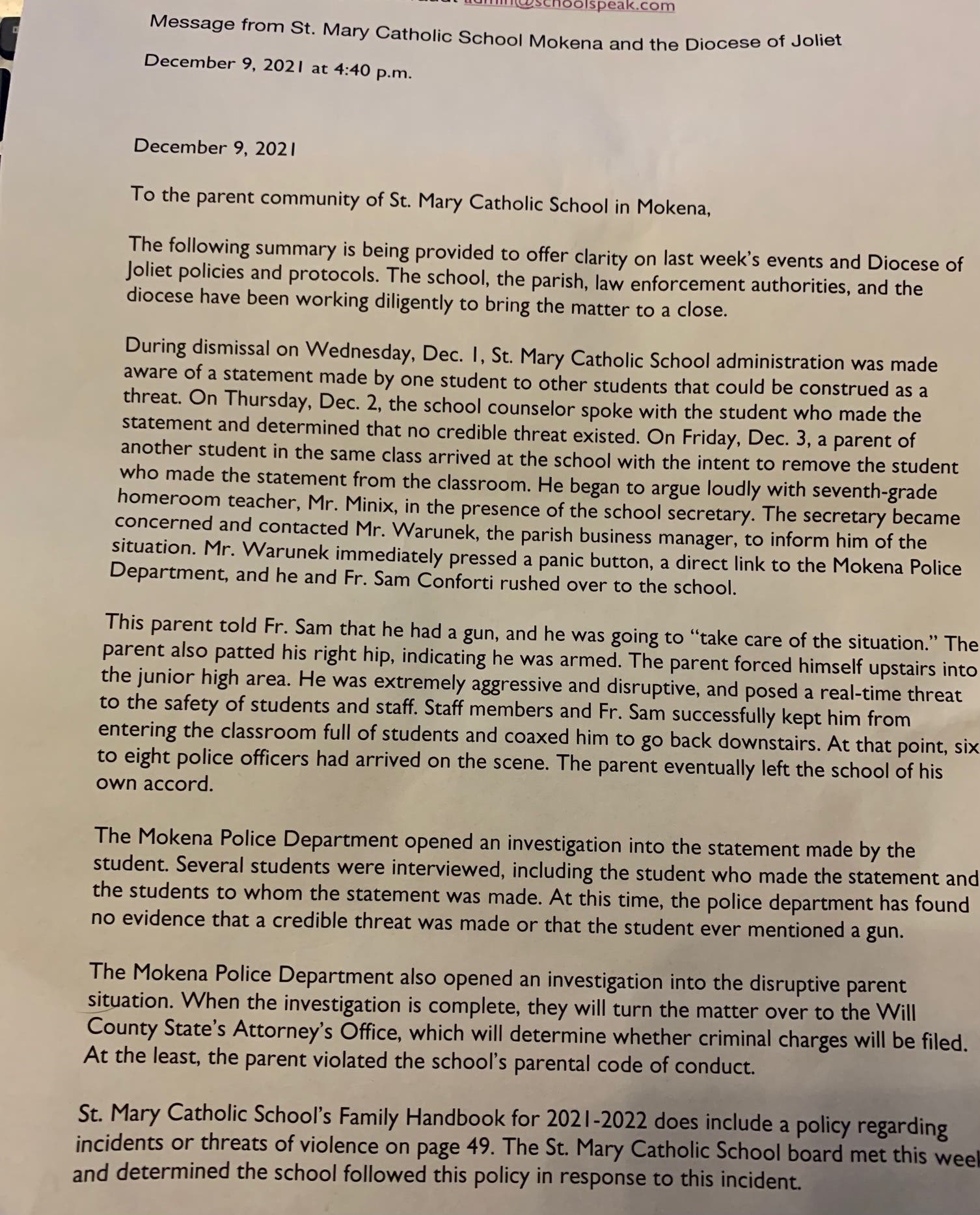 Rather than listening to the concerned parent and decorated Will County Sheriff's deputy, the administrators of St. Mary’s chose to ask him to leave the premises and ultimately requested criminal charges, Bodach said.